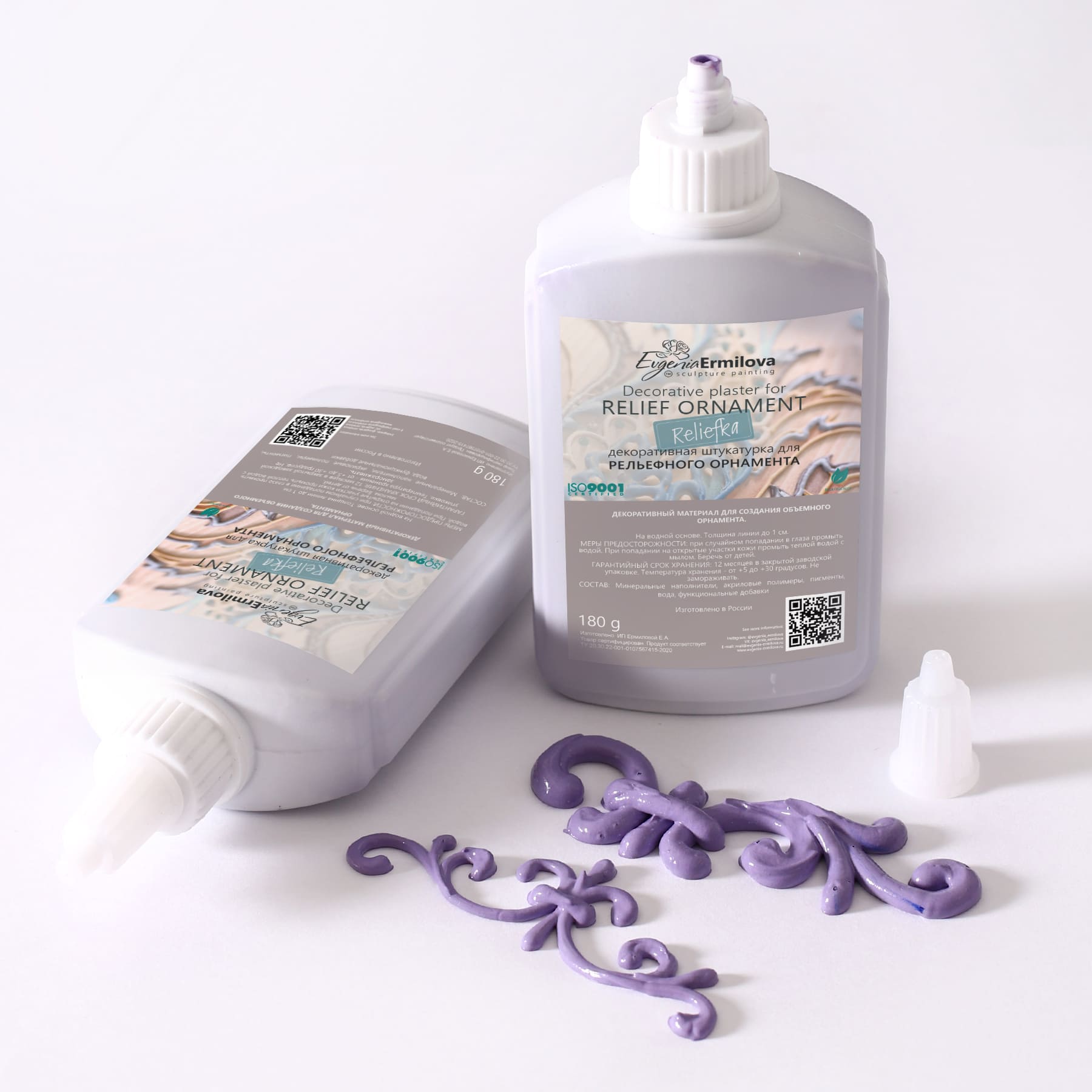 Reliefka "Amethyst" has a rich, especially bright, and colorful shade of purple that coincides in tone with the plaster of the same name for sculptural painting. The juicy color can be used with other shades of the palette of the brand "Evgenia Ermilova": "Violet" and "Purple". The relief ornament from "Amethyst" perfectly complements the paintings from the finished set of plaster "Bright".